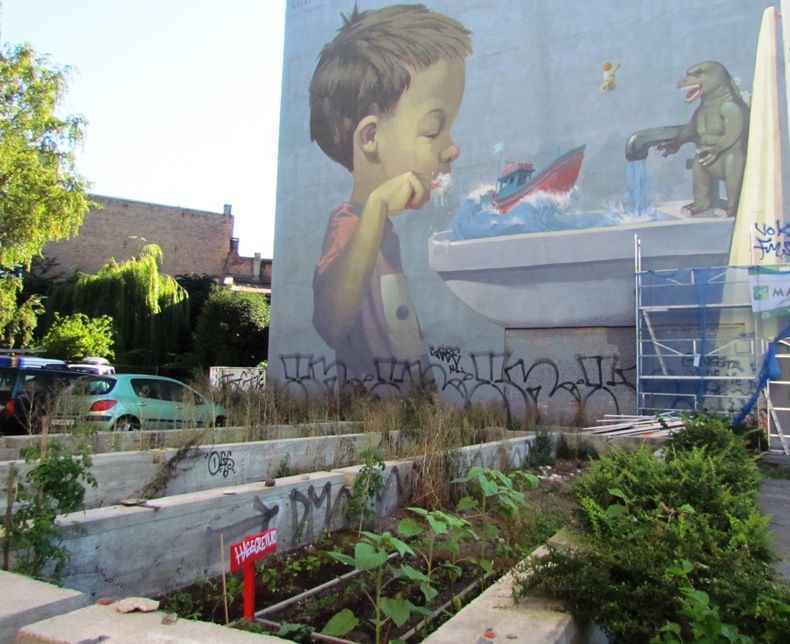 Zaintrygowało nas nie tyle to imponujące graffiti co słoneczniki i grządki roślin uprawnych usytuowane wśród fundamentów przygotowanych zapewne pod jakiś budynek.
