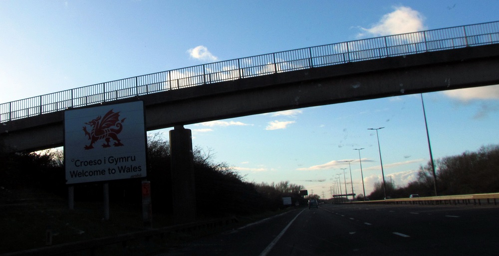 "Witamy w Walii" - napis po walijsku i angielsku poniżej.