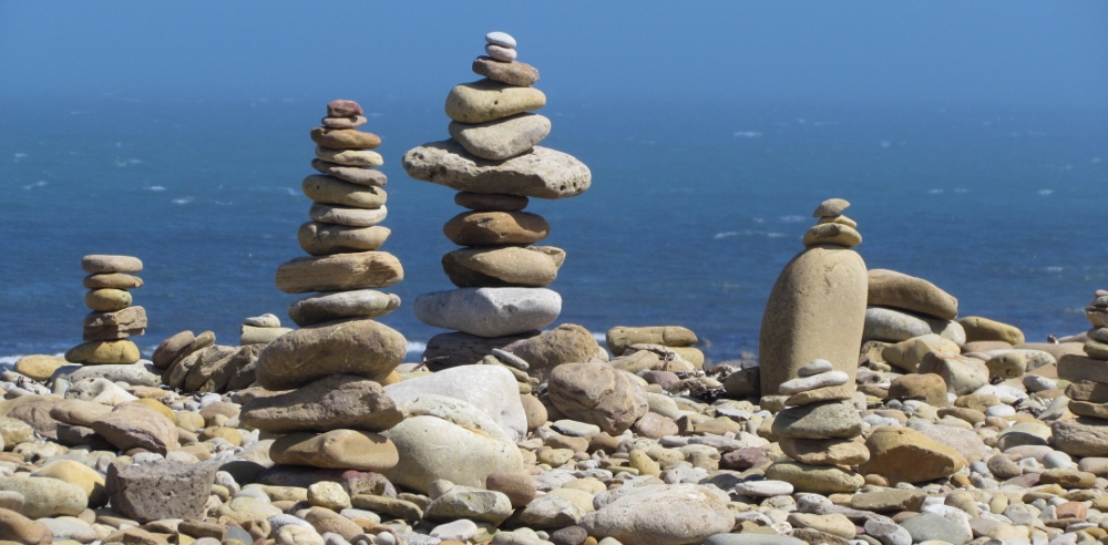 Formacje kamiennych stosów przy plaży.